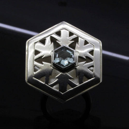JS Aquamarine In Sterling Silver Hand Pierced Large Snowflake Ring