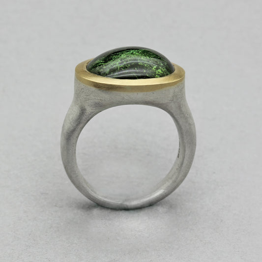 PP Silver and 18ct Gold Cabochon Green Tourmaline Ring