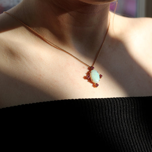 Cabochon Cut Opal & Rubies Set In 9ct Rose Gold Pendant