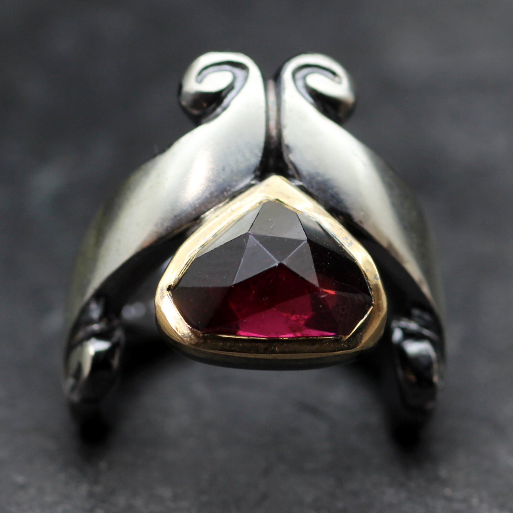 This ring features a vivid pink tourmaline gemstone, set in a rich 9ct gold bezel. The band itself is crafted from polished, oxidised silver with elegant, flowing scroll details that enhance its unique, artistic design. Carefully designed and handcrafted, this piece beautifully combines warm gold and cool silver tones, highlighting the deep pink brilliance of the tourmaline for a bold yet refined statement.
