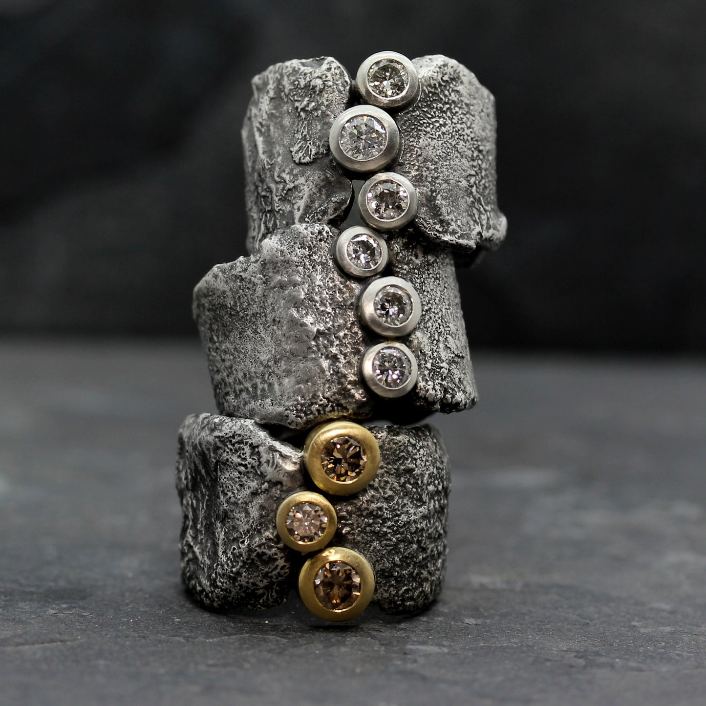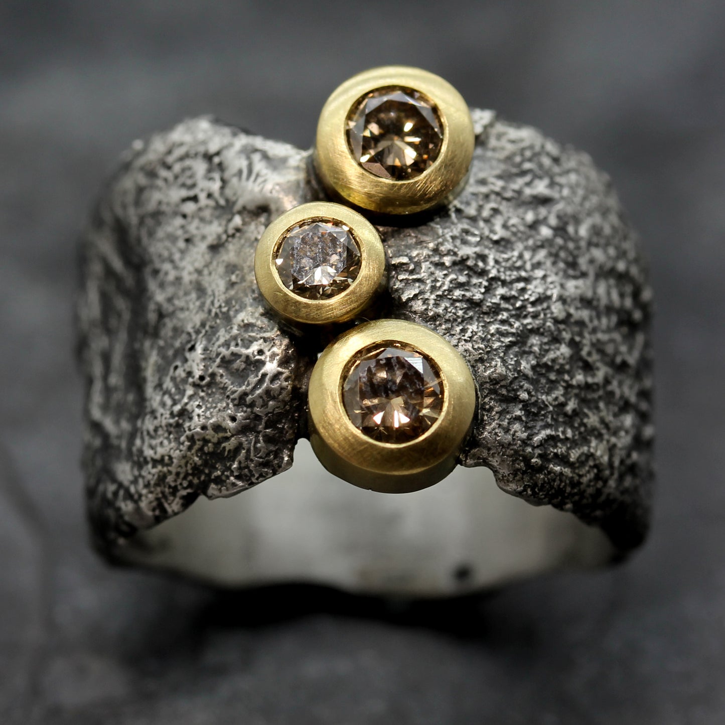 A chunky silver ring with 18ct Yellow Gold settings and three Cognac Diamonds. Total Diamonds weight 1ct.