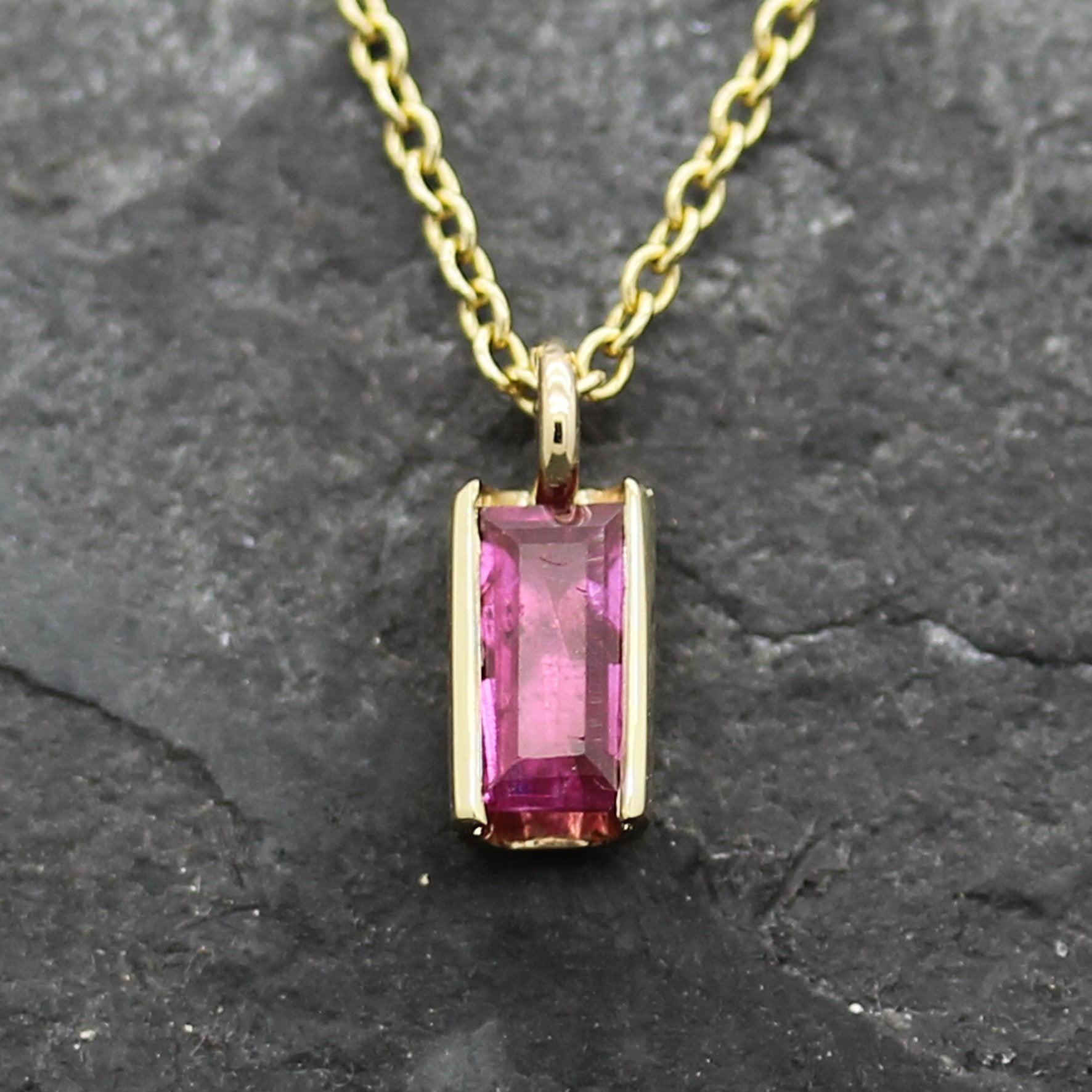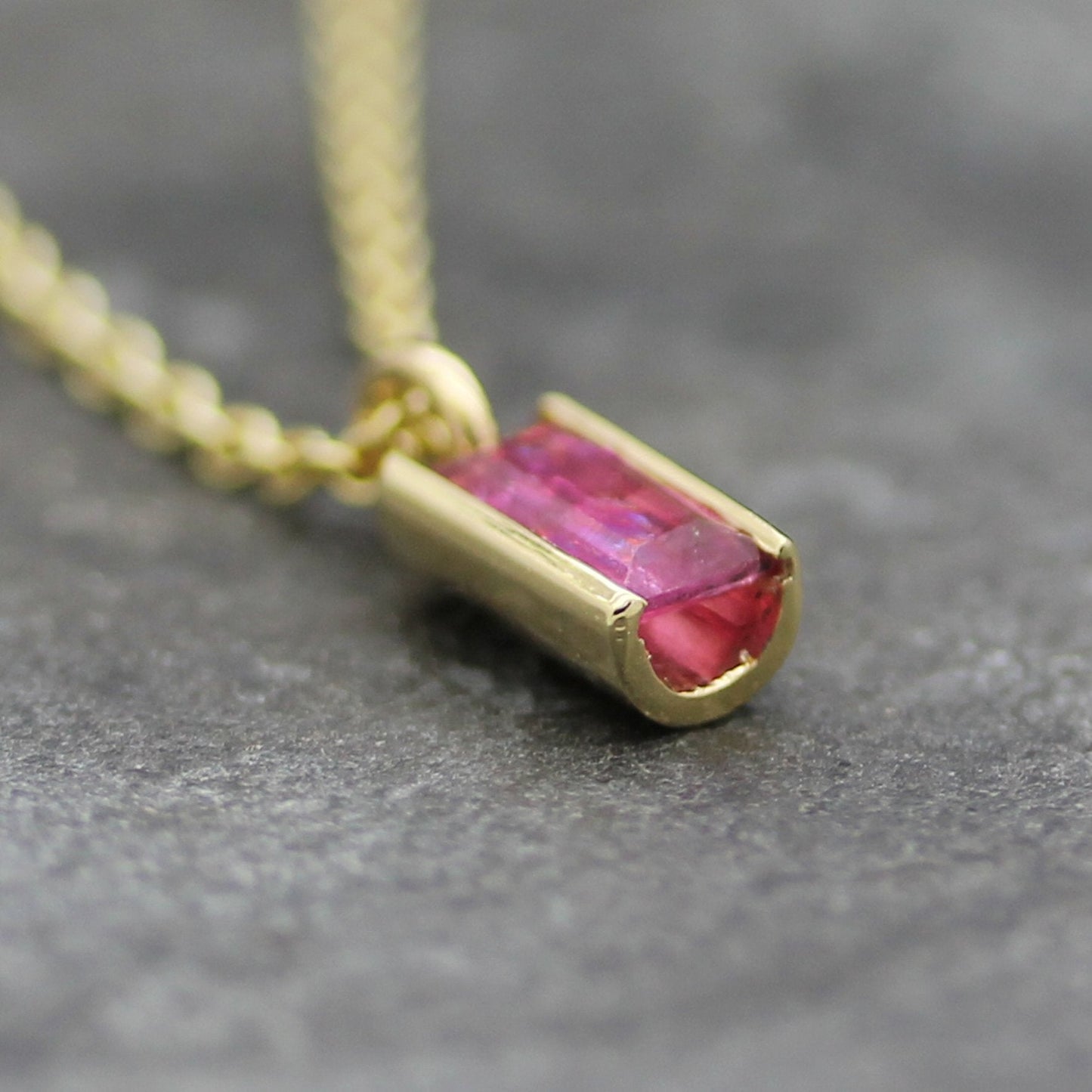 A beautiful Ruby set in a 9ct Yellow Gold setting creates this modern yet elegant pendant design. A mini version of the classic 'Flute' design, for a more affordable and versatile piece